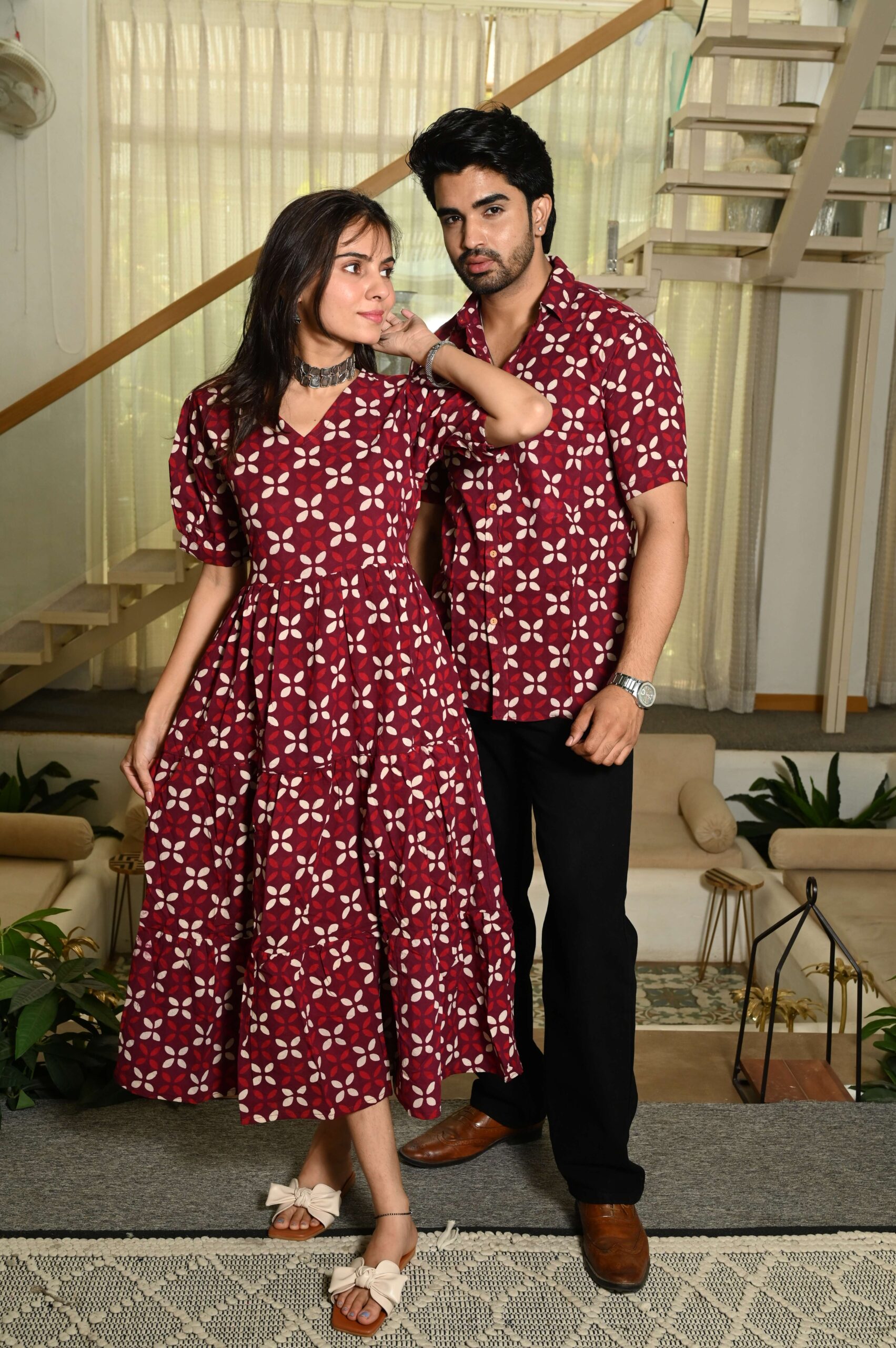 A bold and elegant maroon cotton outfit featuring a white floral print. The puff-sleeve dress with a flowy silhouette and the collared shirt make the perfect combination for festive occasions, outings, and casual celebrations.